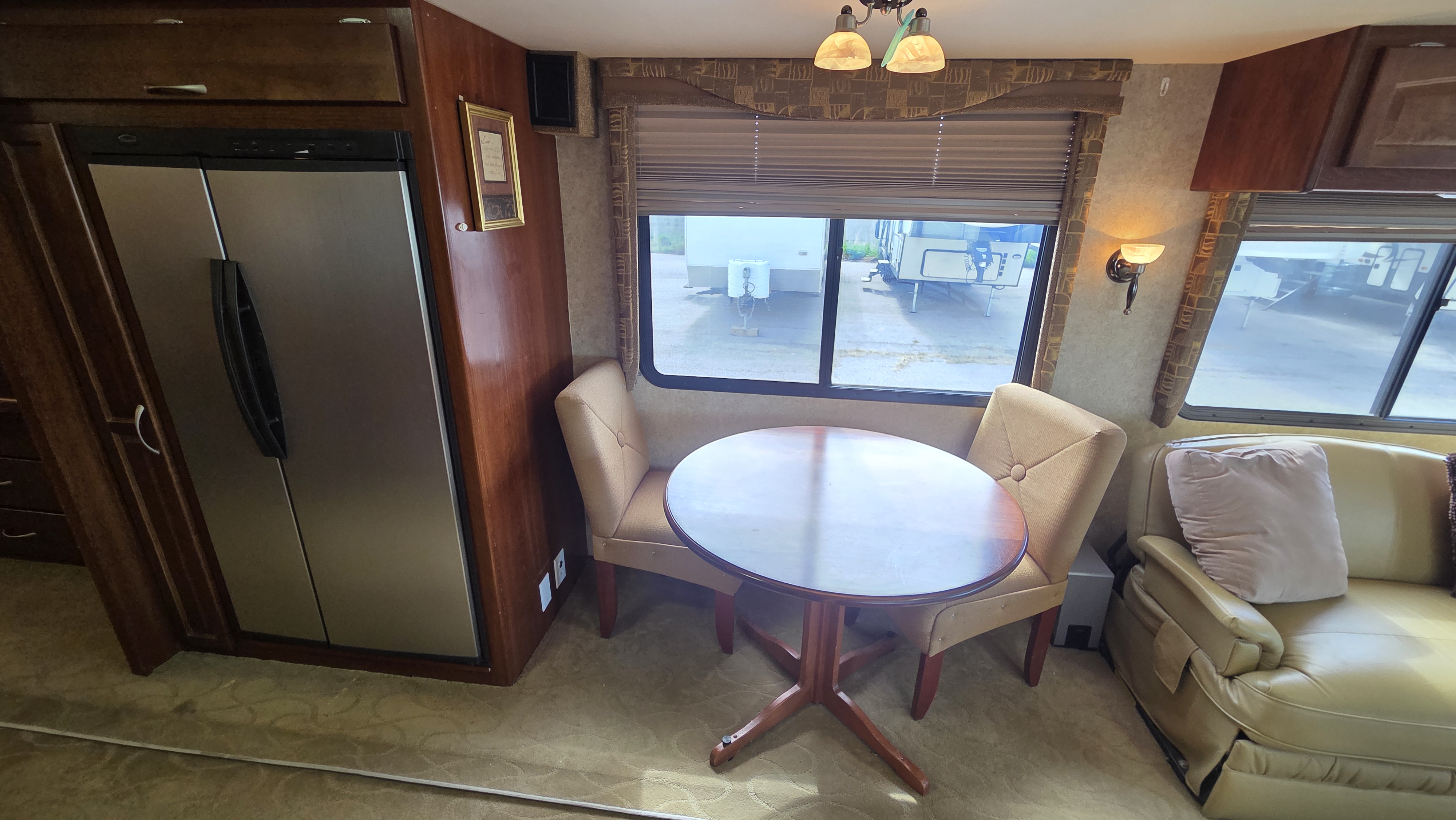 The table and chairs setup offers a more residential dining feel compared to a standard booth, and the overall layout comfortably sleeps four.