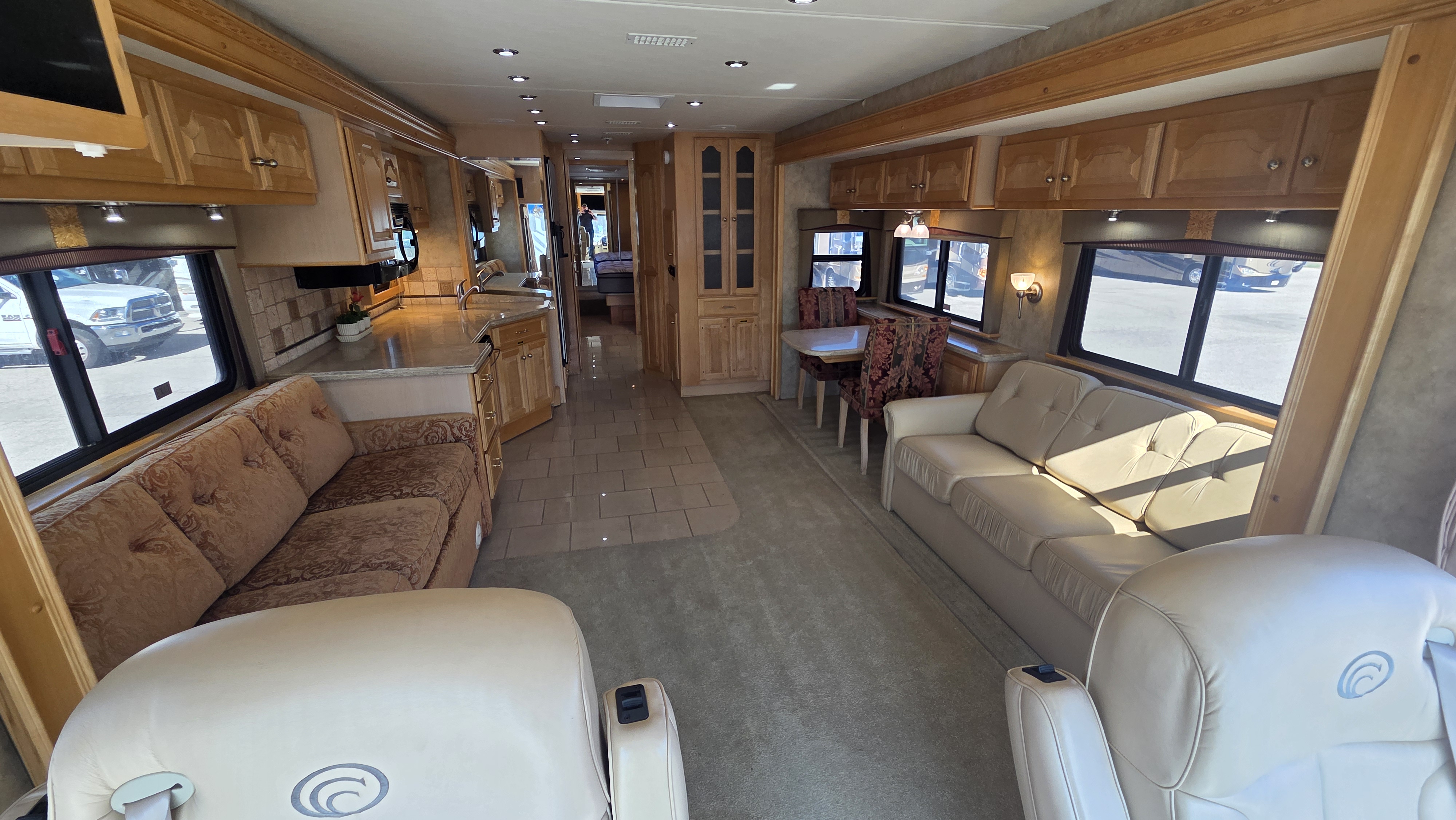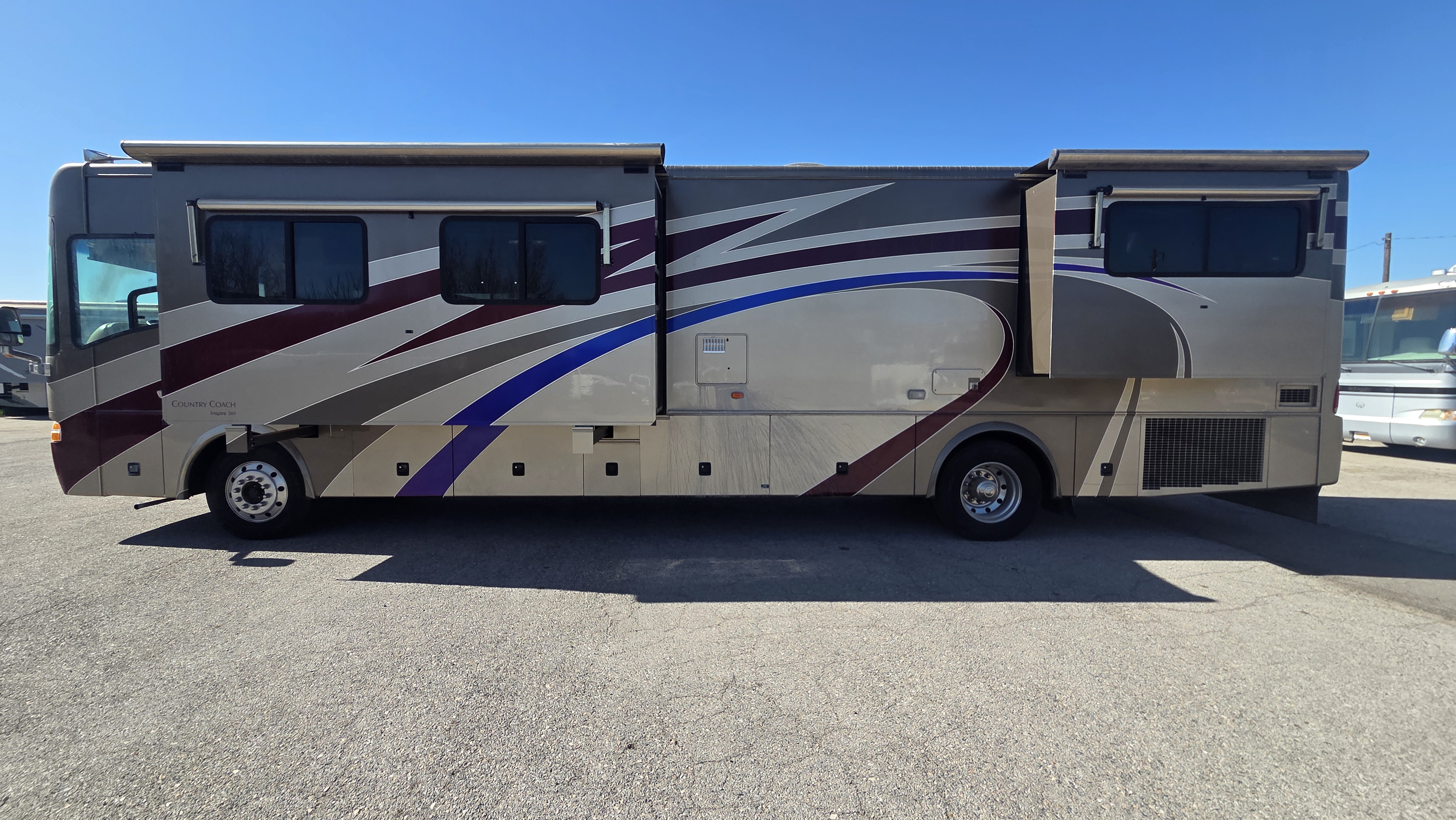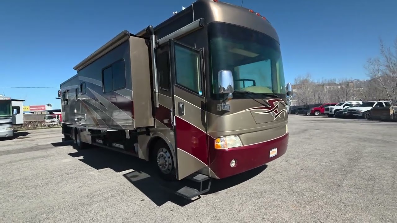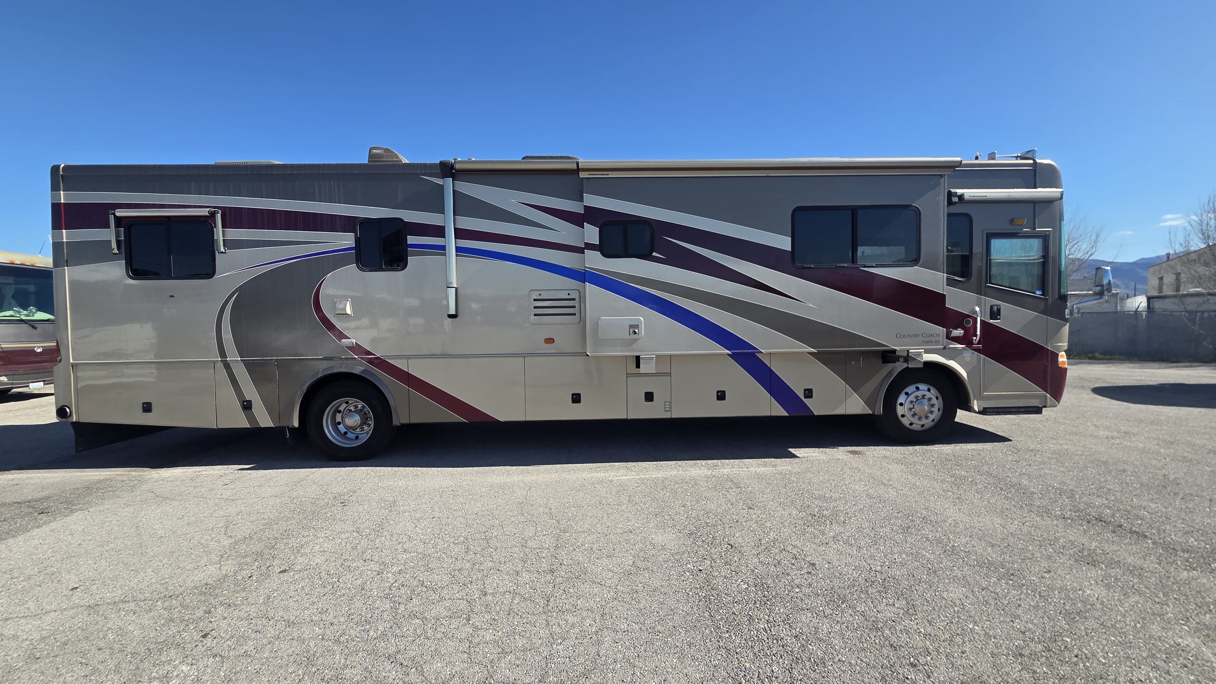 This 2006 Country Coach Inspire 360 Genoa diesel pusher is a high-end luxury motorhome built on the DynoMax raised rail chassis and powered by a 400 HP Caterpillar C9 turbo diesel paired with an Allison 3000MH 6-speed transmission. Country Coach was known for exceptional build quality, solid hardwood cabinetry, and bus-style construction, making these coaches highly sought after.
