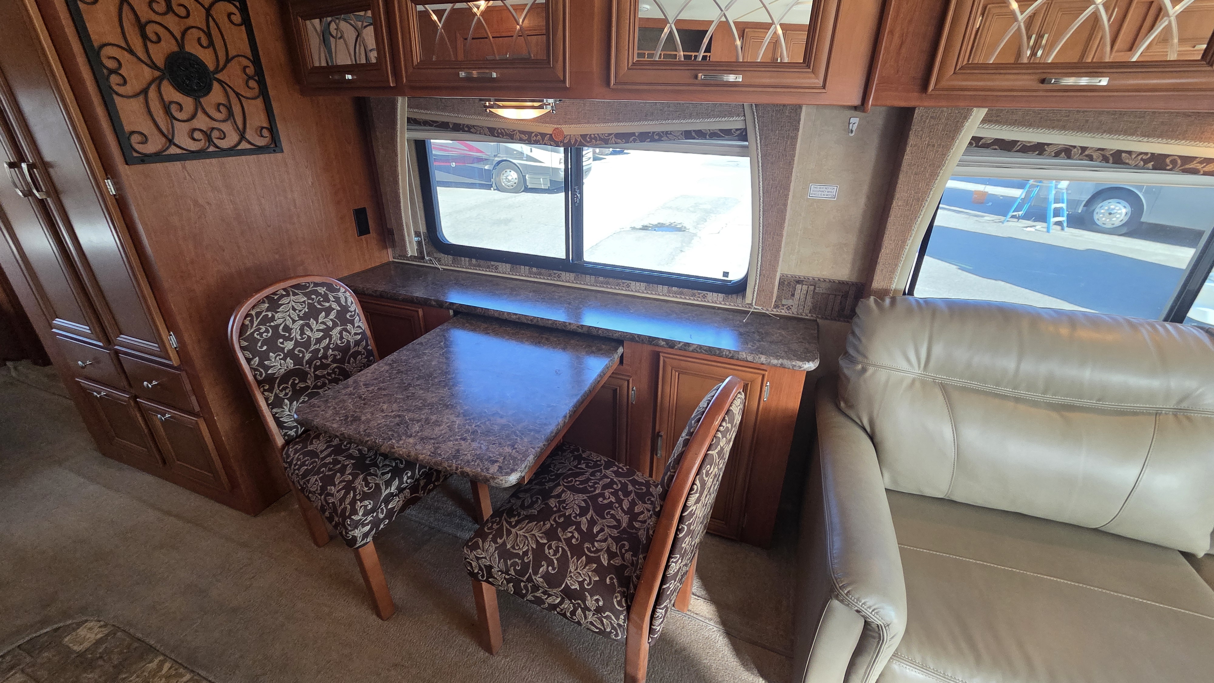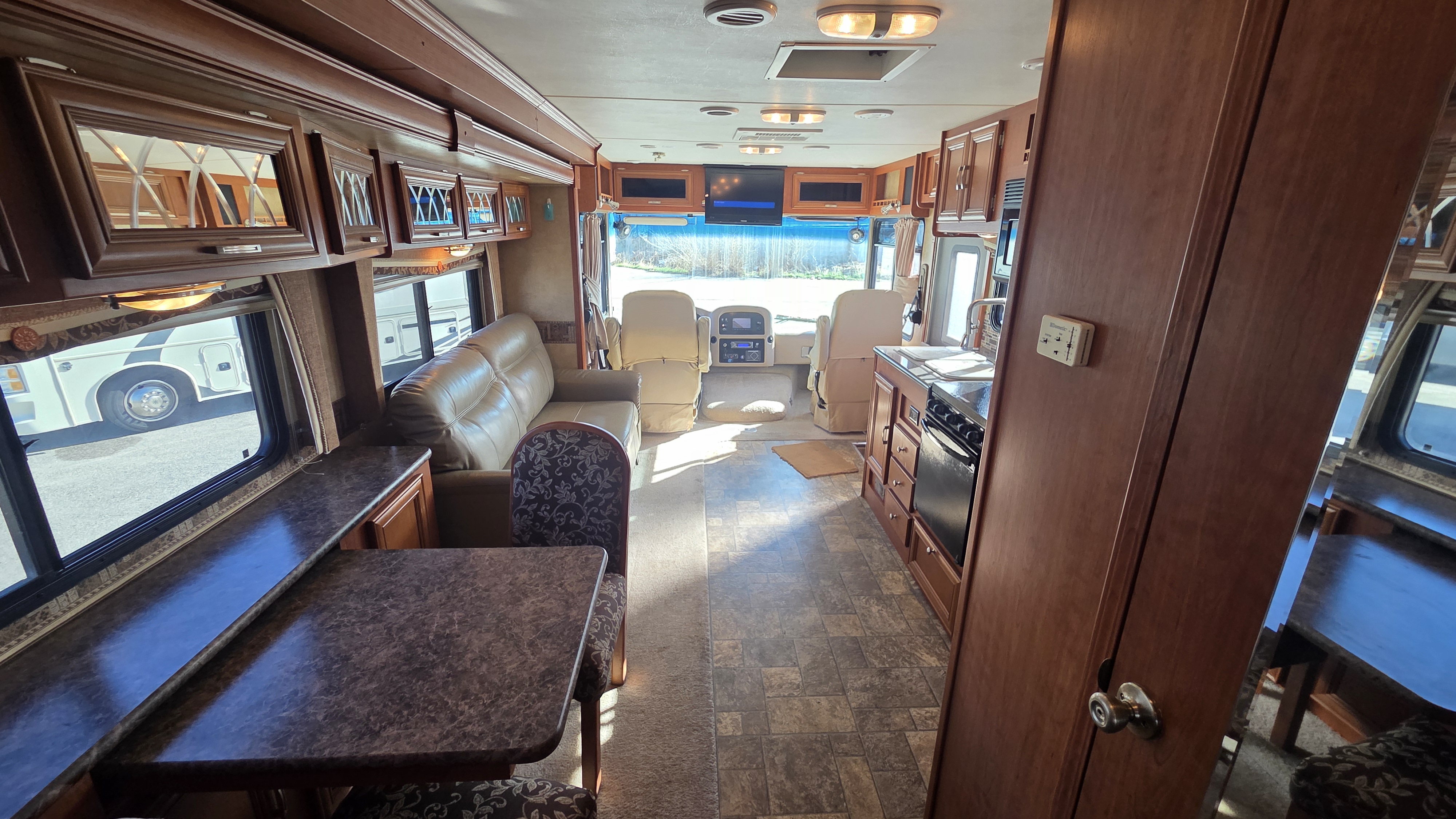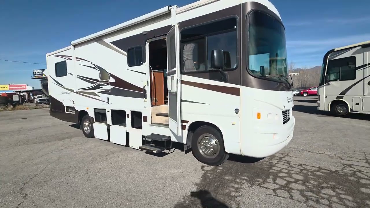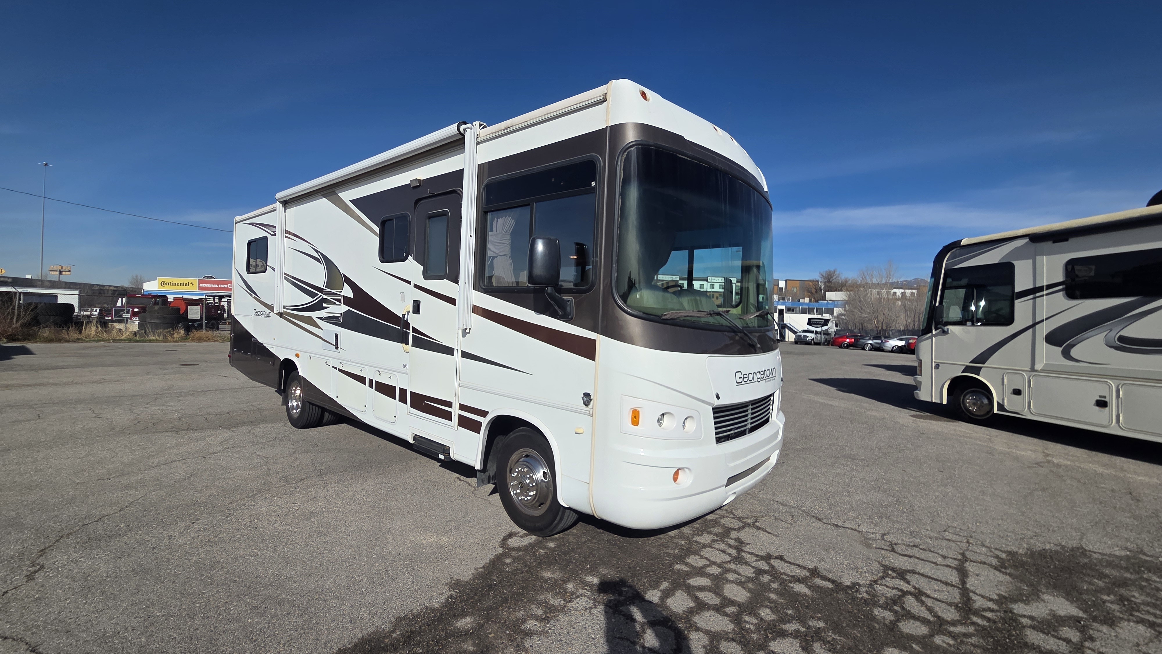This Georgetown 300S is a strong option for buyers looking for a well-equipped Class A motorhome with automatic leveling, dual ducted A/Cs, heated tanks, table-and-chairs dining, and dependable Ford V10 power.