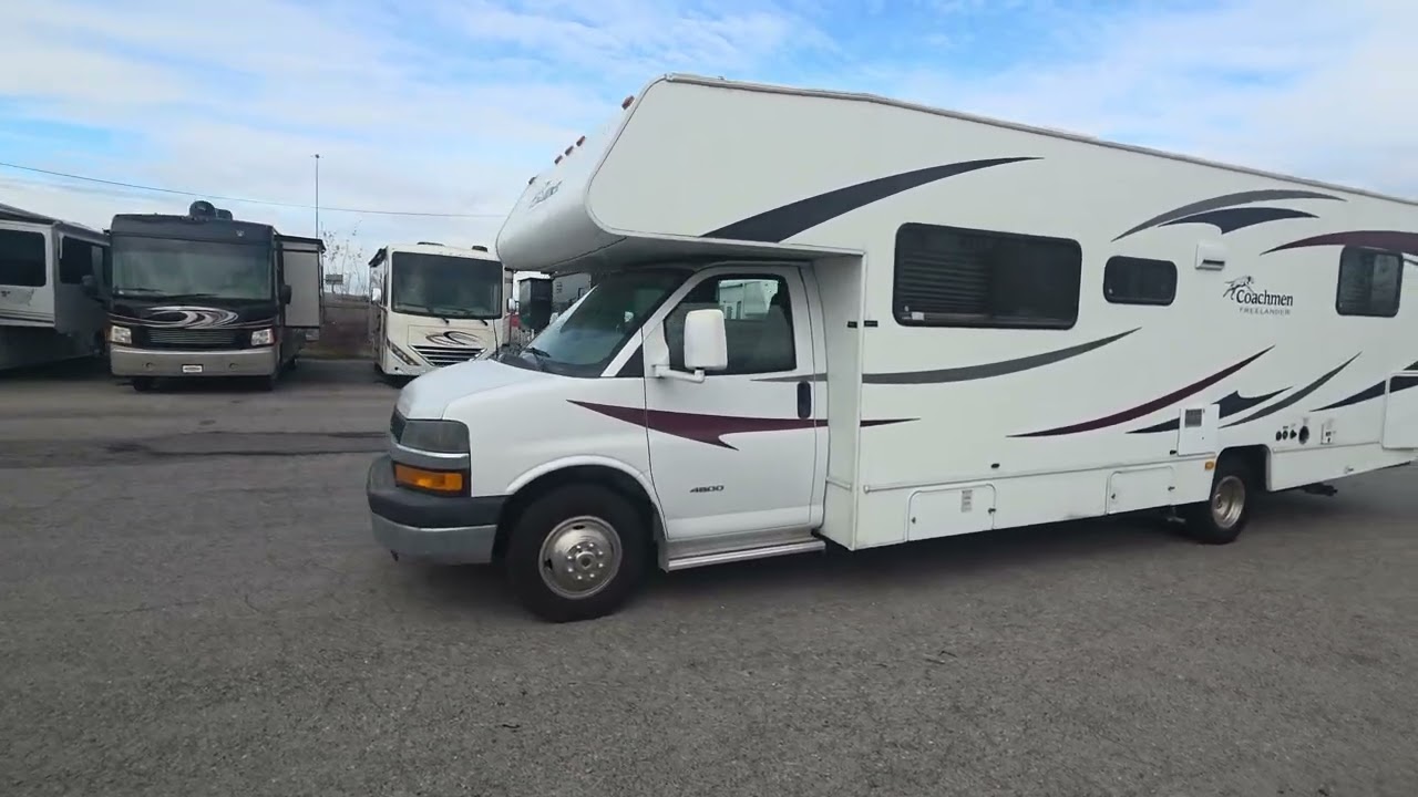 This 2012 Coachmen Freelander 28QB on the Chevy chassis is a compact, easy-driving Class C motorhome known for its large rear storage garage, open floorplan, and durable construction. This unit has 11,326 miles, 68 hours on the Generac generator, a backup camera, and was driven in from Las Vegas.