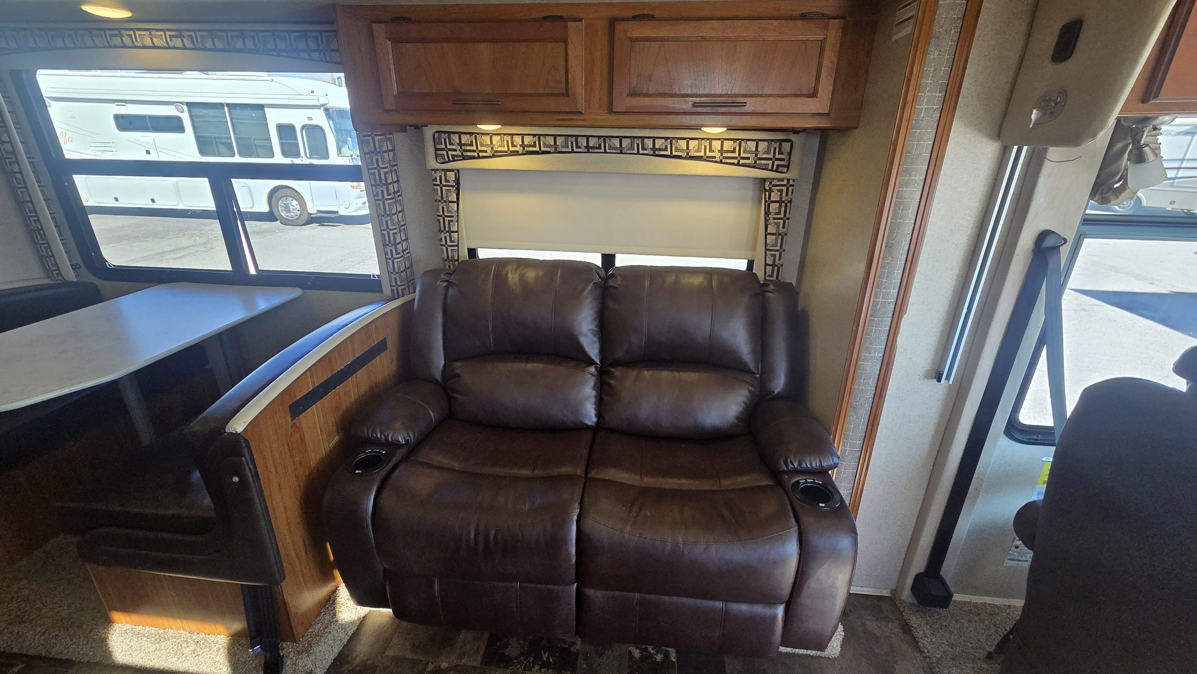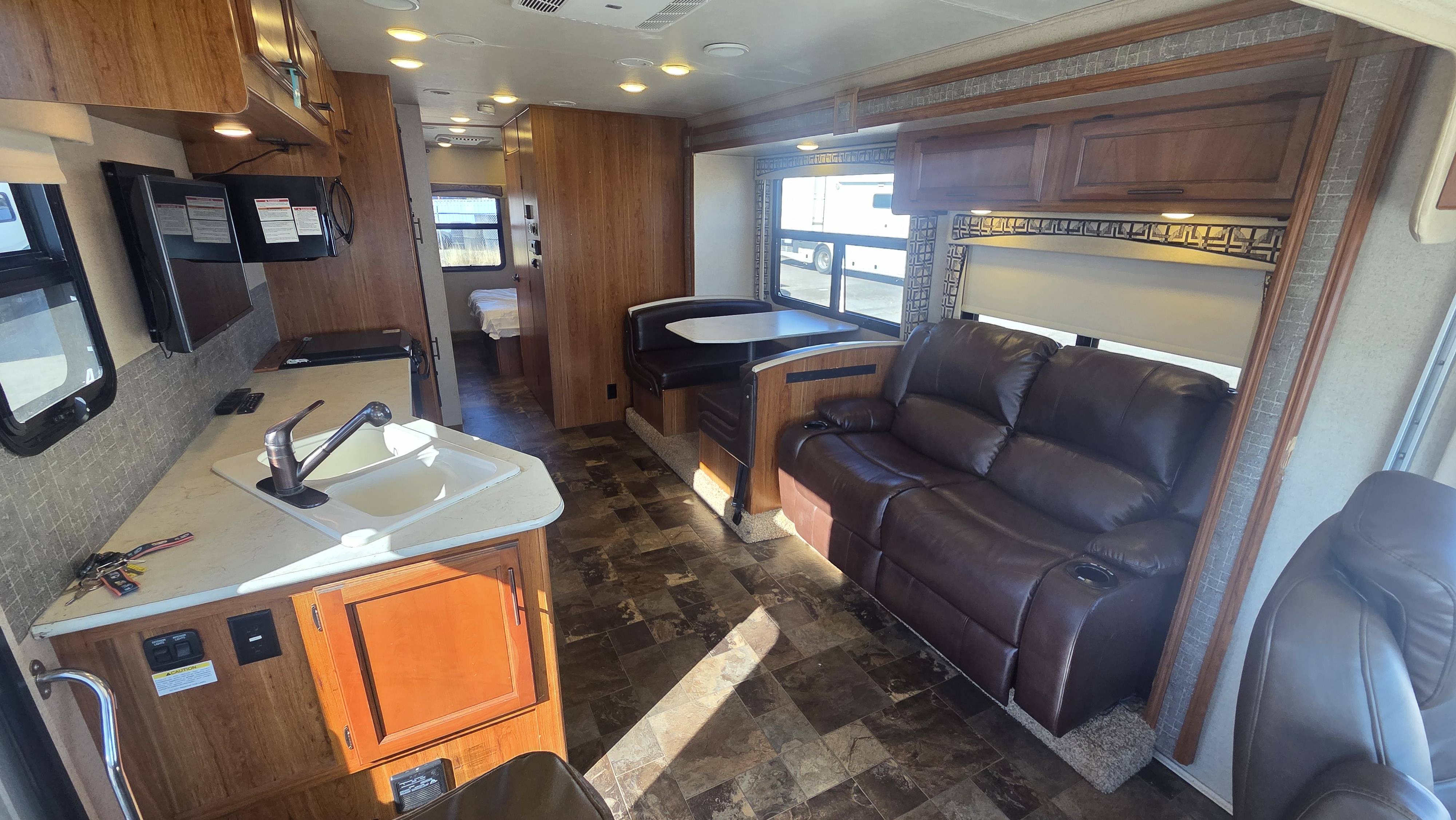 Inside, dual slide-outs open up a spacious living area, a well-equipped kitchen, and a cozy rear bedroom. The upgraded recliner couch, convertible booth dinette, and drop-down overhead bunk make it flexible and comfortable for travel or extended stays.