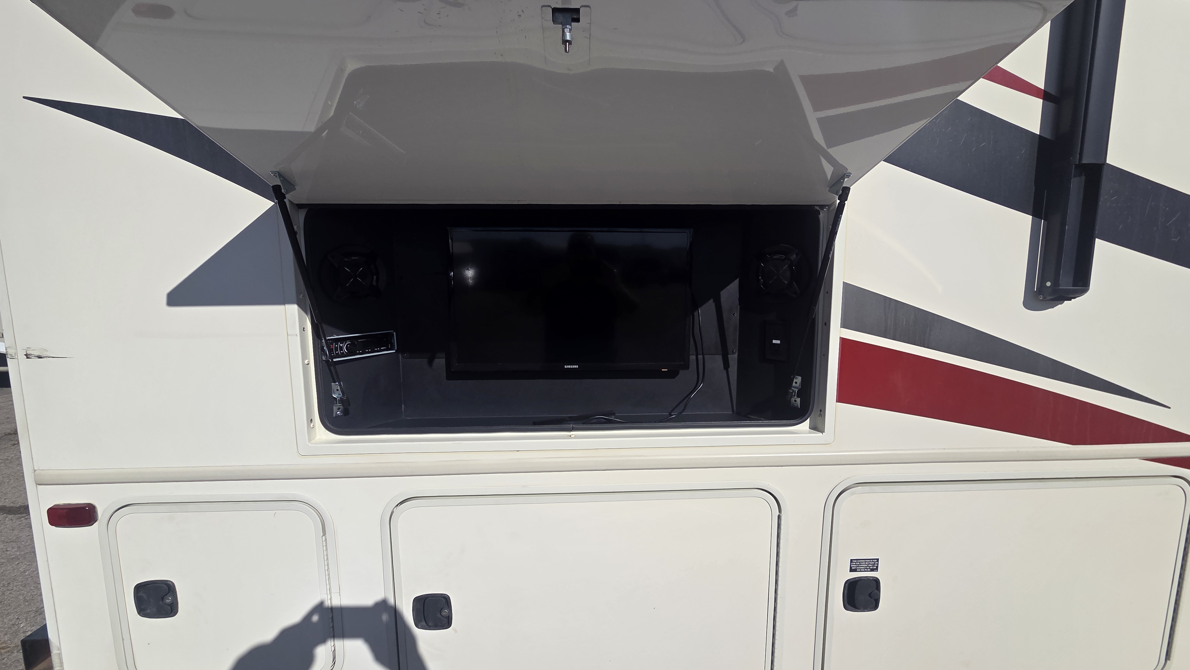 Outside, enjoy a flat-screen TV and stereo system under the power awning — perfect for tailgates or relaxing evenings at the campground.