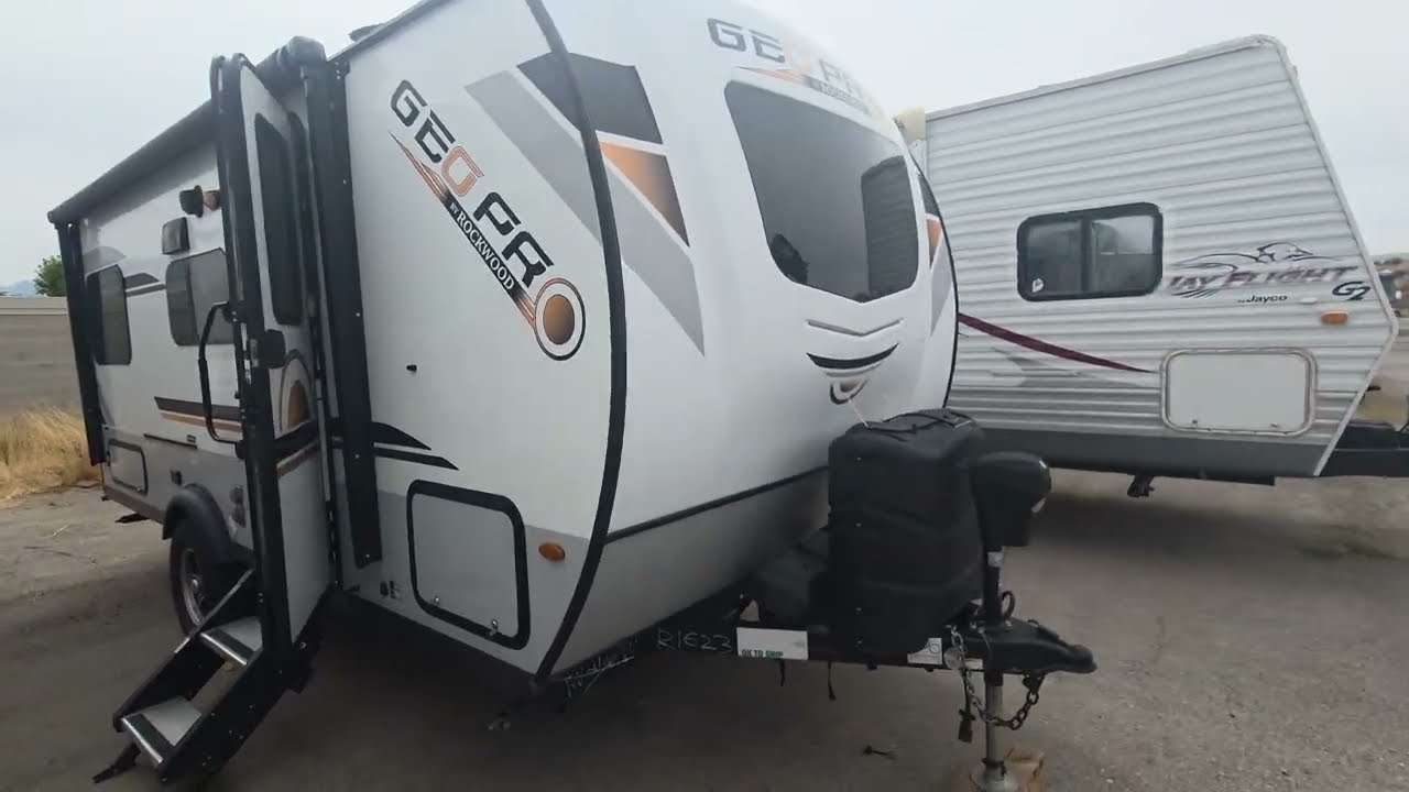 This 2020 Rockwood Geo Pro G19RD is a lightweight, easy-to-tow travel trailer with a functional rear-dinette layout and well-equipped interior. The G19RD offers the Geo Pro standard off-grid features, full kitchen, comfortable sleeping options, and a compact footprint ideal for smaller tow vehicles.